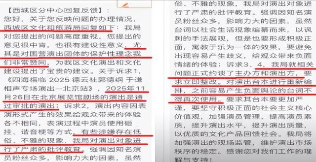 灯熄,掌声散去,录音笔里的哄笑成了证据。十二月初,西城区文旅局把郭德纲叫去喝茶,文件上写明“存在低俗、不雅内容”。